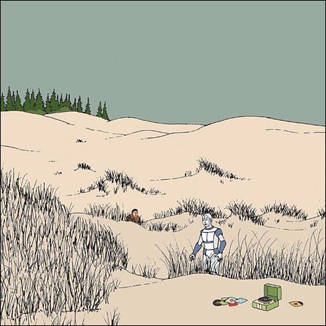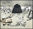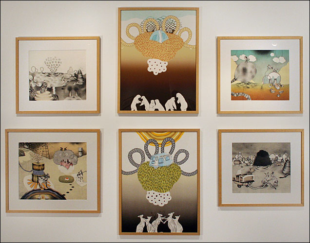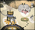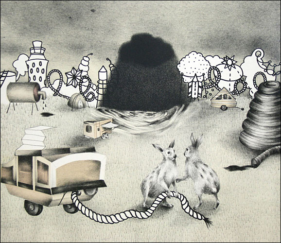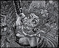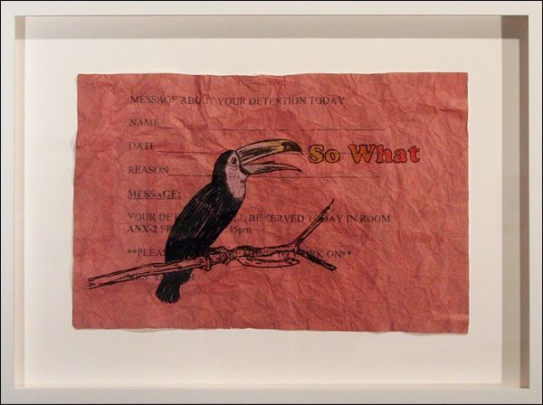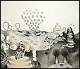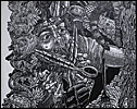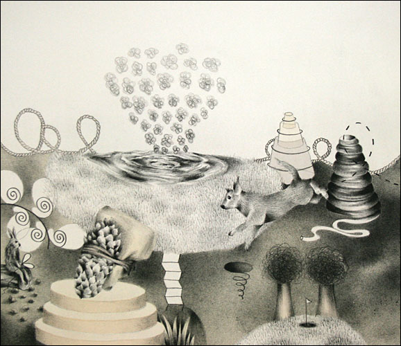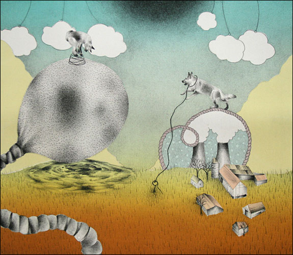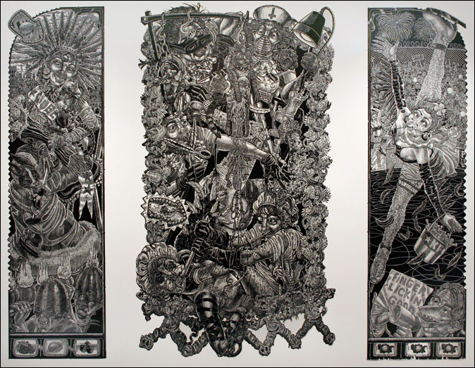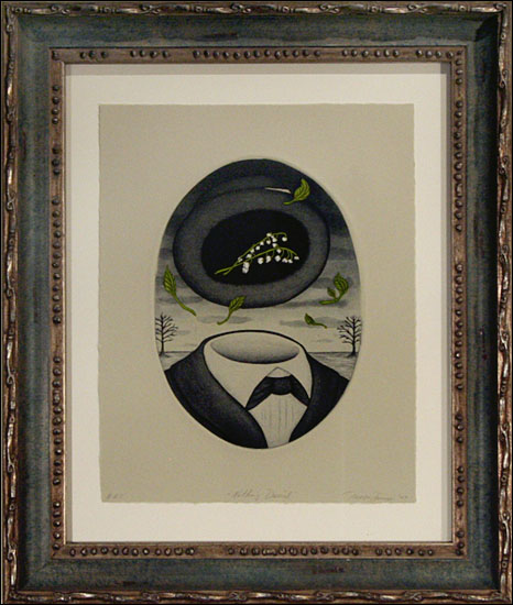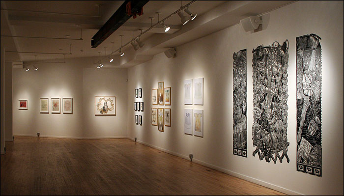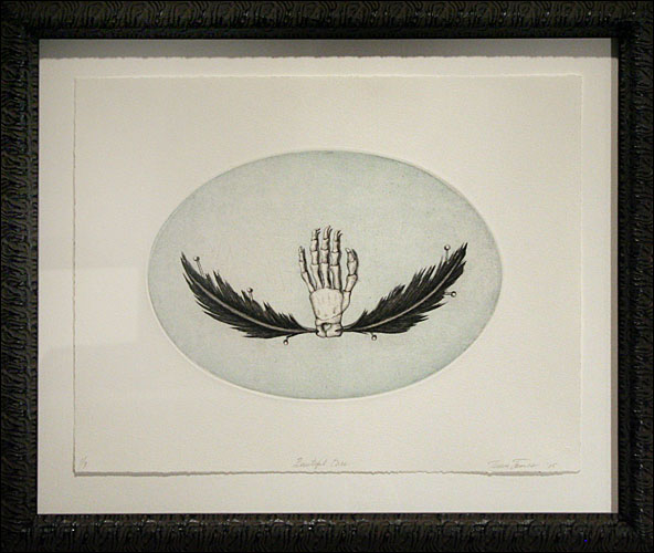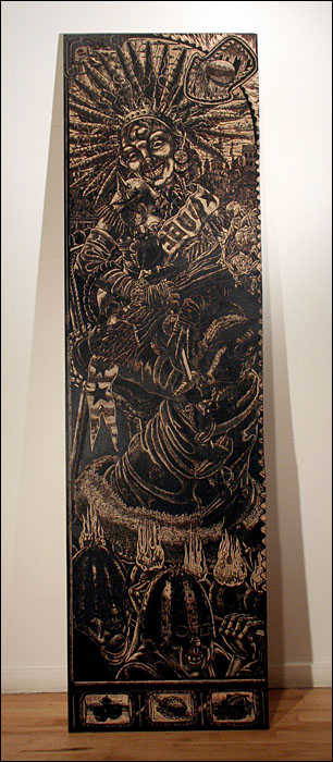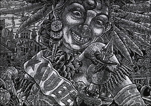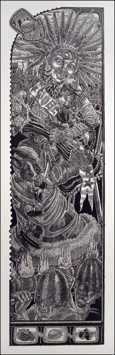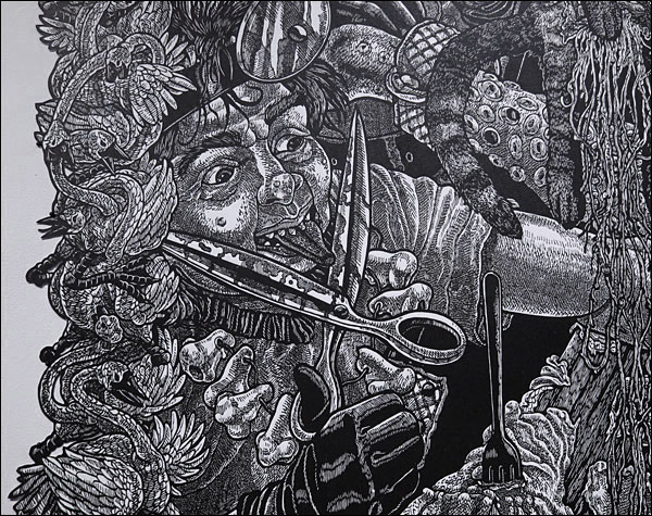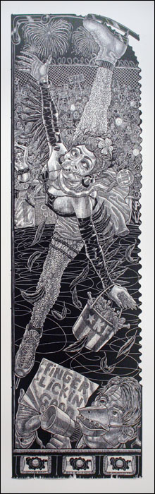 Translated this means "This is not a print show." Get it? With that in mind, we are having a huge group print show featuring such print heavyweights as Tom Huck, Michael Krueger, and Teresa Mucha James. Tom Huck's large-scale woodblock prints are reminiscent of the underground comic imagery of the 60's and early 70's. Michael Krueger is inspired by his old high school ledger notebooks, intact with all the kind of doodling... race cars, marijuana symbols, women with big breasts,.... And Teresa Mucha James is the owner of White Wings Press. James fuses numerous influences: Folk Art, Victoriana, Renaissance painting; she succeeds in lending her subjects an air of peace and serenity. As a master printer, Teresa has worked with Tony Fitzpatrick, Ed Paschke, Martin Mull and many others.