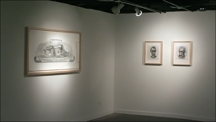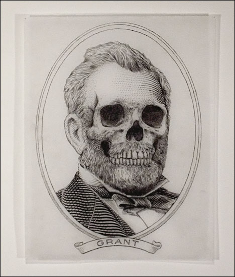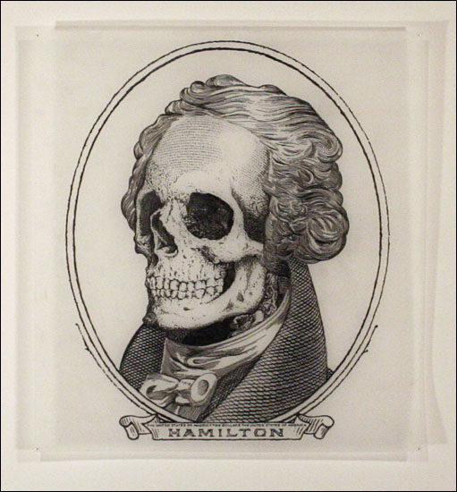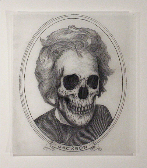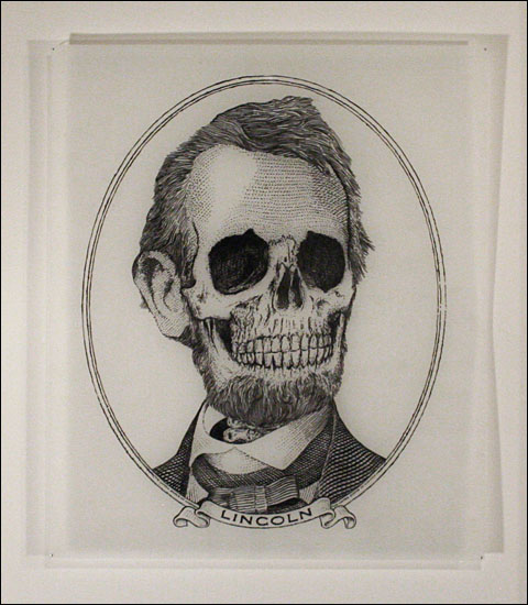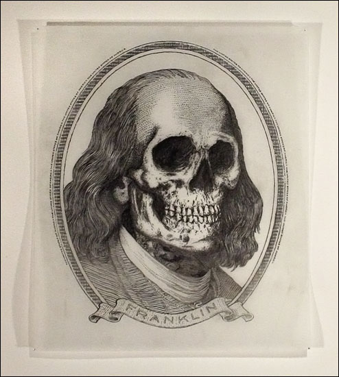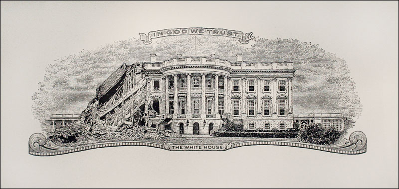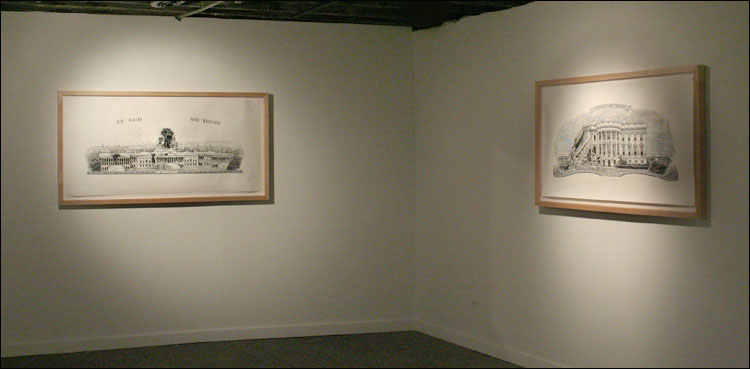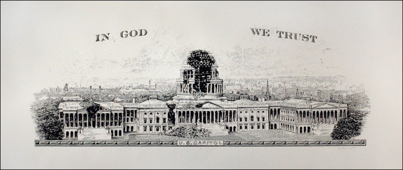 Damn Nation, a collection of relief prints by Curtis Readel, explores the tensions and attitudes regarding our current economic state through manipulated images. In his first exhibition at Packer Schopf Gallery, Readels recent work addresses themes and ideas of history, deteriorated morality, and apocalyptic premonitions. Appropriating the monuments found on U.S. currency, their now crumbled edifices expose fragility, the future these structures face and how short-lived empires can be. Reflecting issues of self-indulgence, corruption, and societal downfall, these metaphors signify that nothing is permanent.