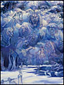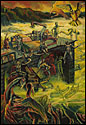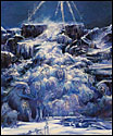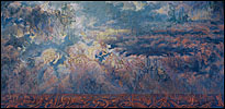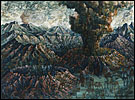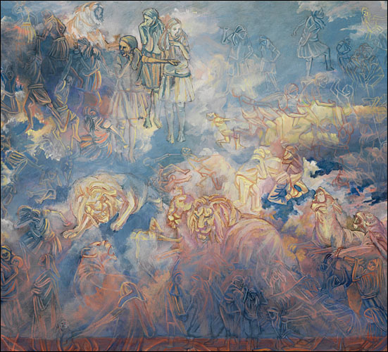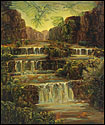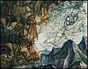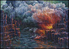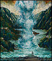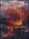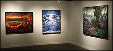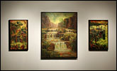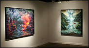 Painting allows Porterfield to bring organization to situations she perceives as overwhelming. She often reference acts of nature to represent situations that are out of control, both literally and figuratively. Her Catholic upbringing, symbolized through overpowering landscapes, has been a particular influence on her work. Sweeping vistas, geysers and volcanic eruptions are comprised of religious paradigms and saints, who completed seemingly heroic acts by giving unconditionally. Multi-figured narratives and metaphors depict her struggle to balance these ideals with the need to nurture oneself. Through the dichotomous nature of the work, her intention is to create a metaphysical discussion regarding the struggle to live a compassionate life.