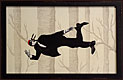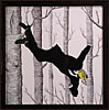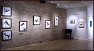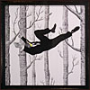 Mark Crisanti -- paints human figures with various bird heads free falling from birch tree wallpaper. These "men" in business suits are reminiscent of the well-known 80's series by Robert Longo. The fact that these bird-headed-entities are not flying, metaphorically plays with what one is seeing and the disconnect with the avian reference.